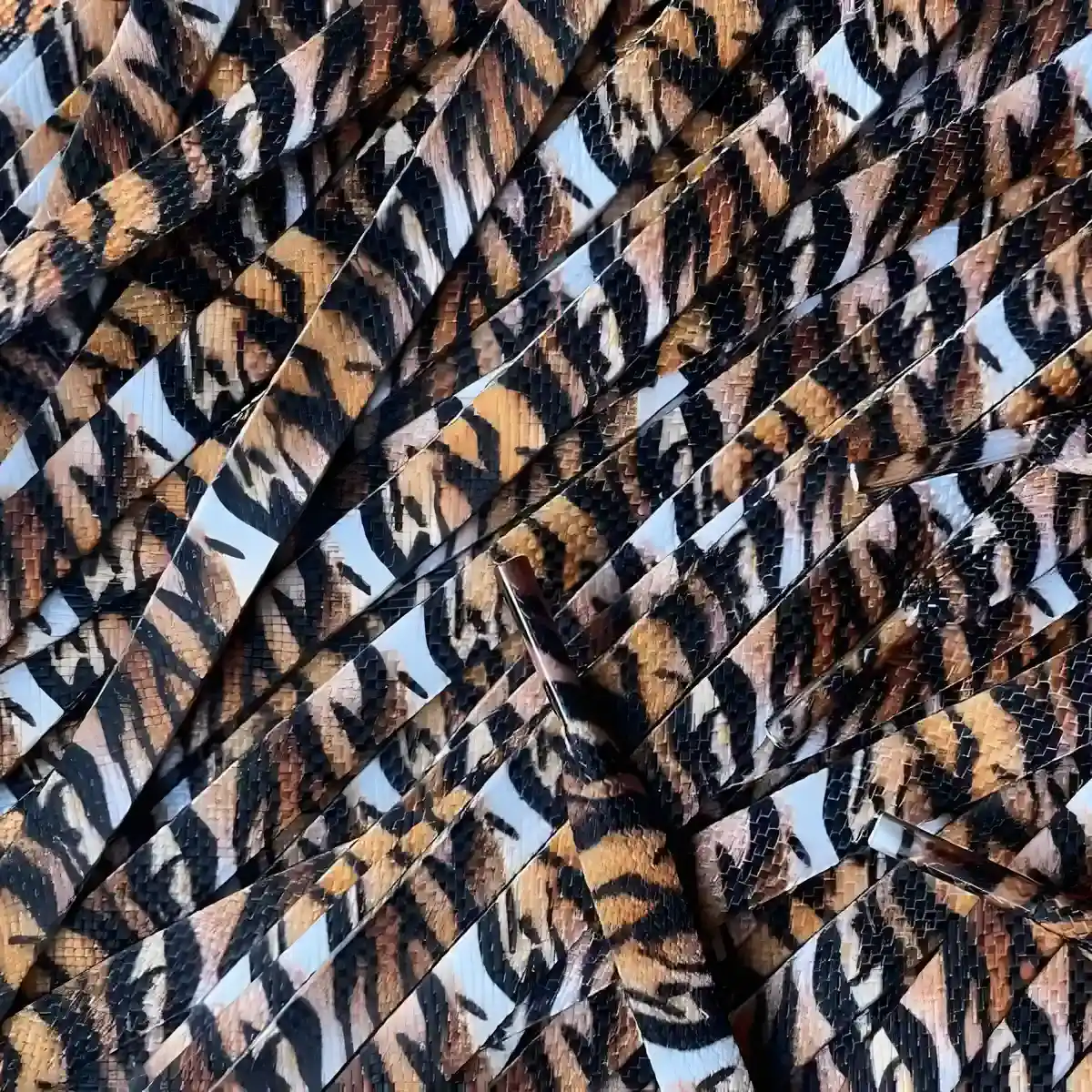 Orange and white tiger laces give your shoes a new look. Orange is a powerful color that radiates energy and creativity. These laces combine style with durability for a unique look. Discover more colors and variations in our collection of print laces.